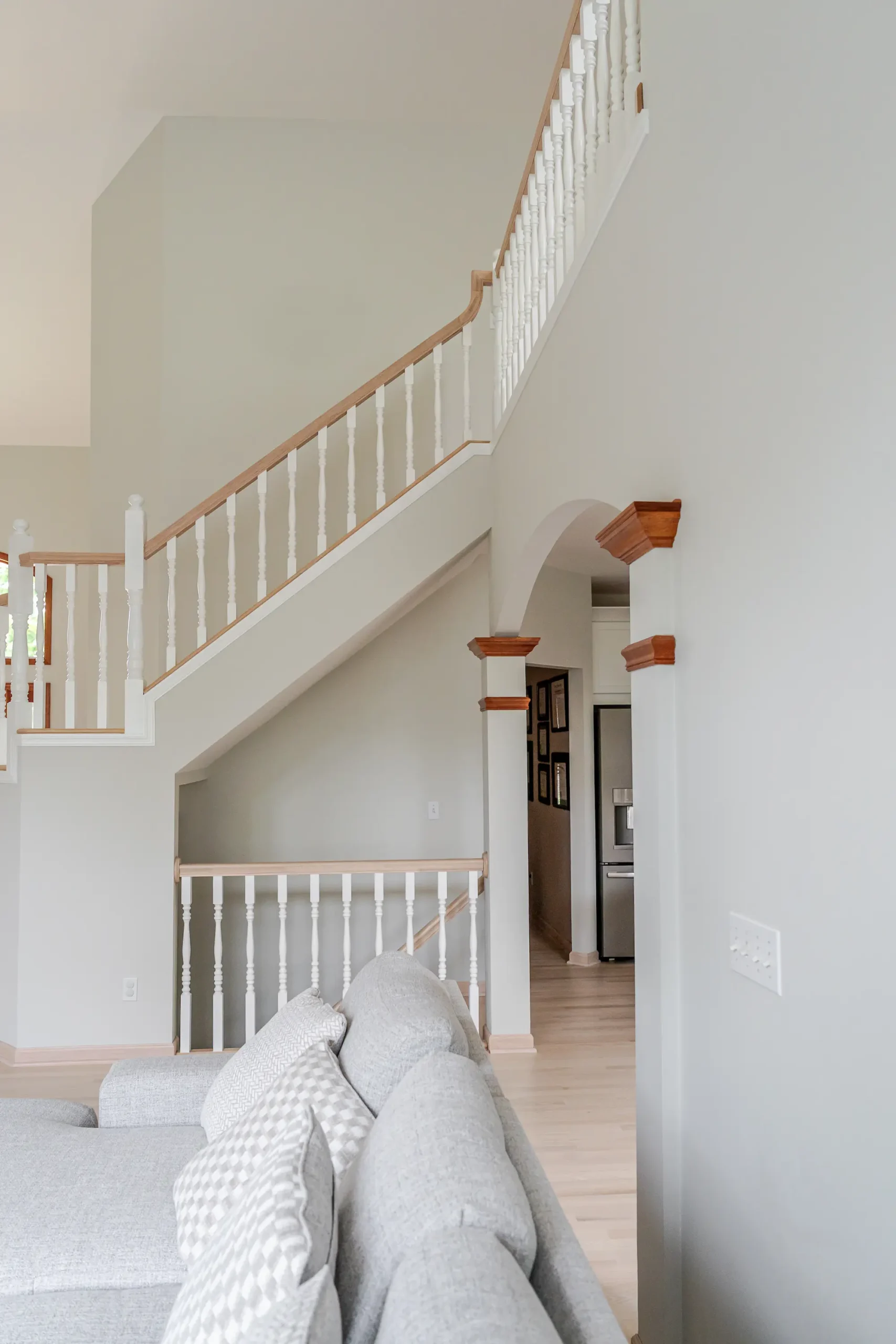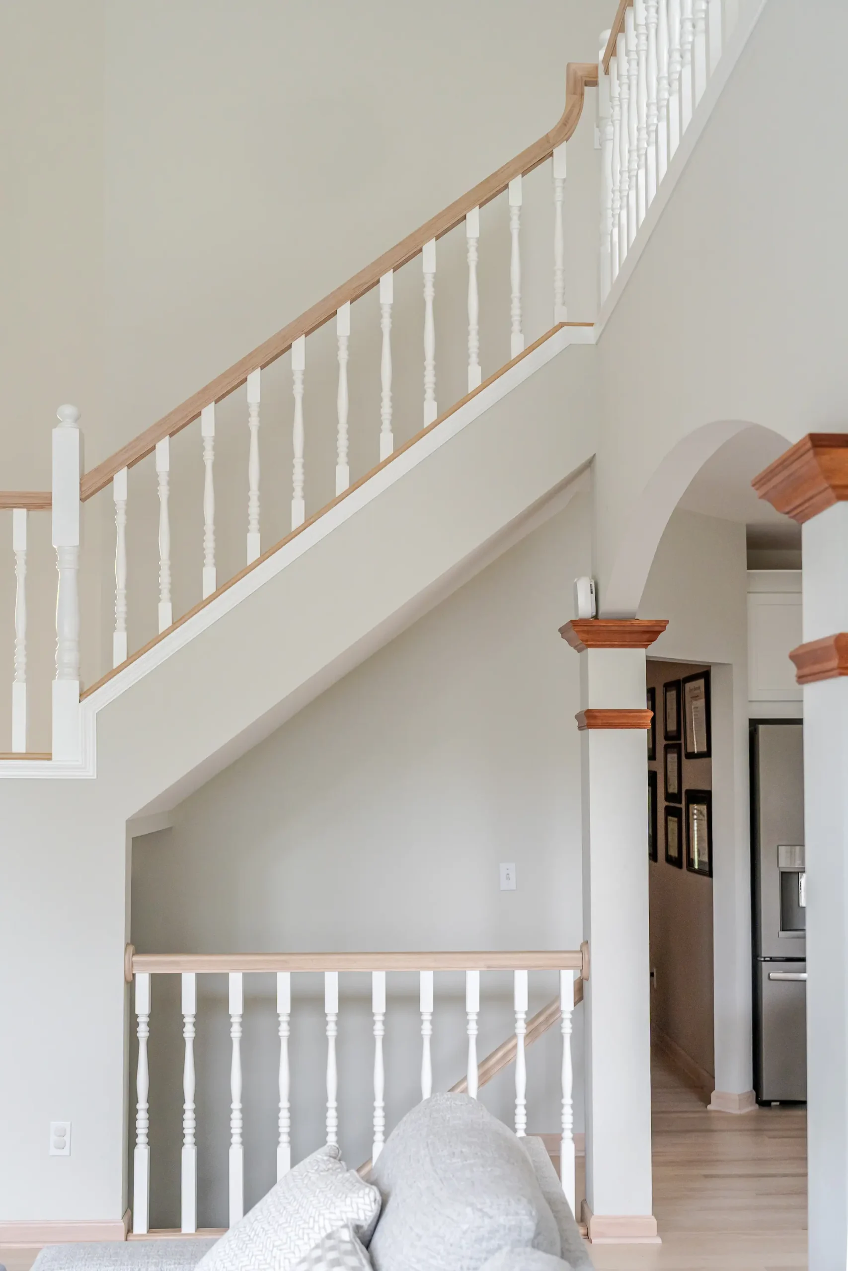 This project encompassed a kitchen renovation and floors. For the kitchen we kept the original footprint, but added new cabinetry, countertops and hardware. Additionally, we enhanced the layout by adding smart technology features and accent lighting. For the floors, we removed 2500 square feet of carpeting and installed hardwood floors in a whitewash finish along with all of the baseboards and shoe molding to match the new floors and stain. For the stairs, we custom built the treads and risers and stained the railings to match the floors. Lastly, to create a bit of contrast, we painted the balusters and risers white.