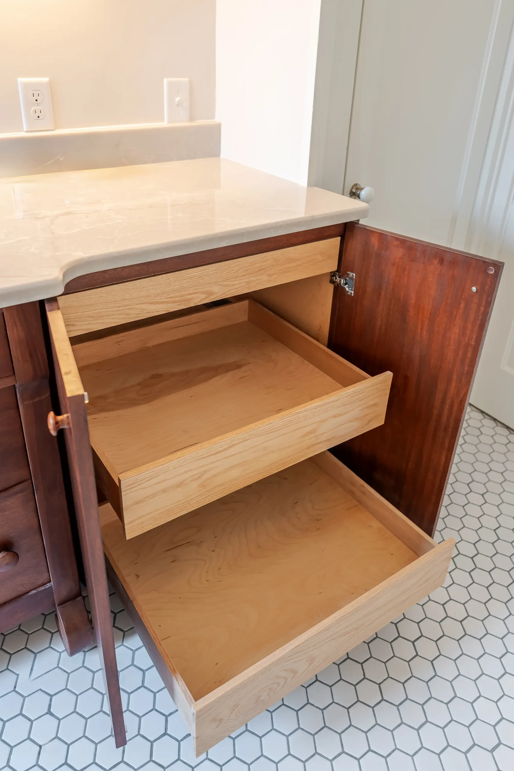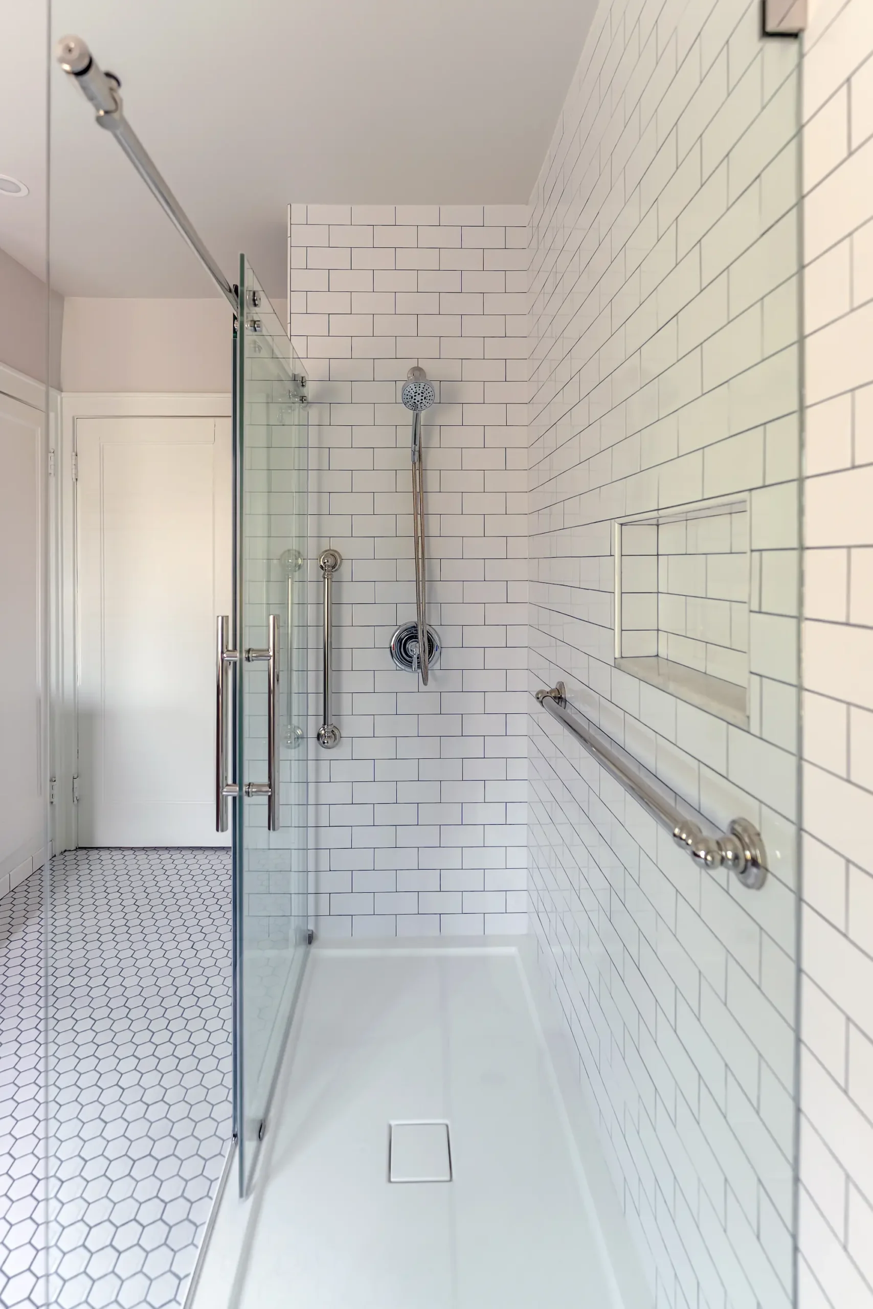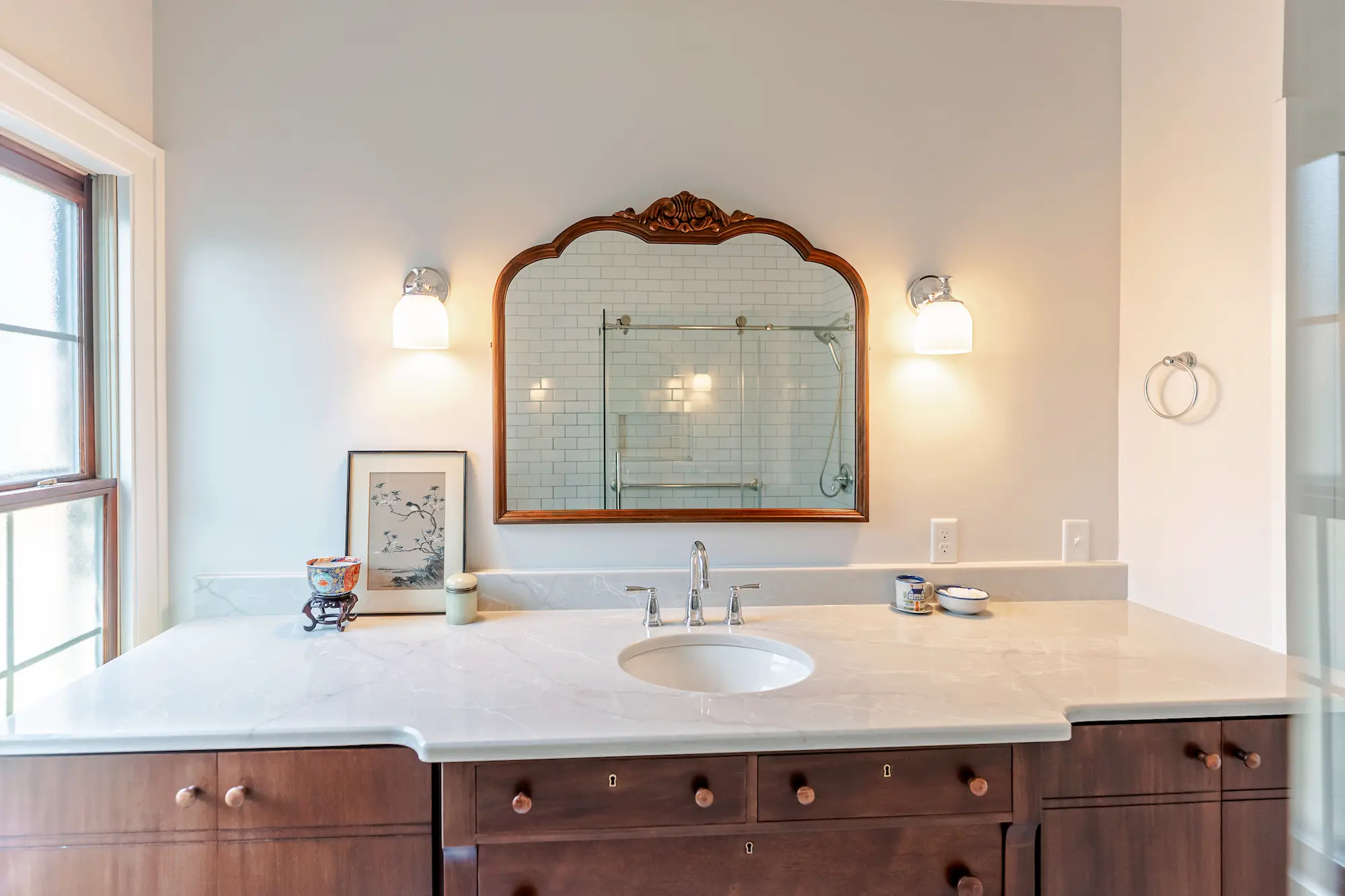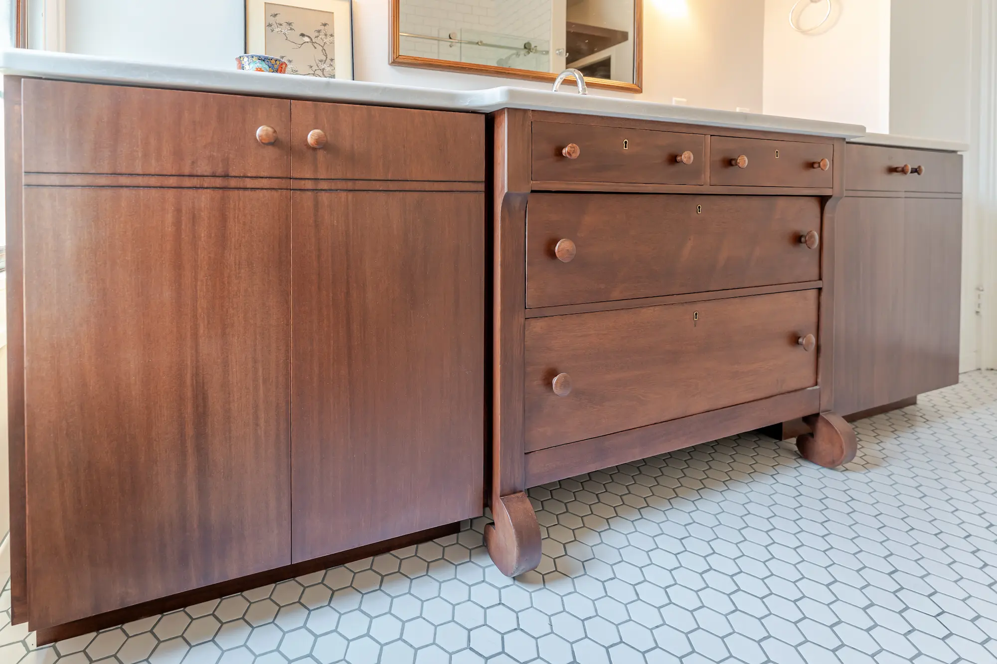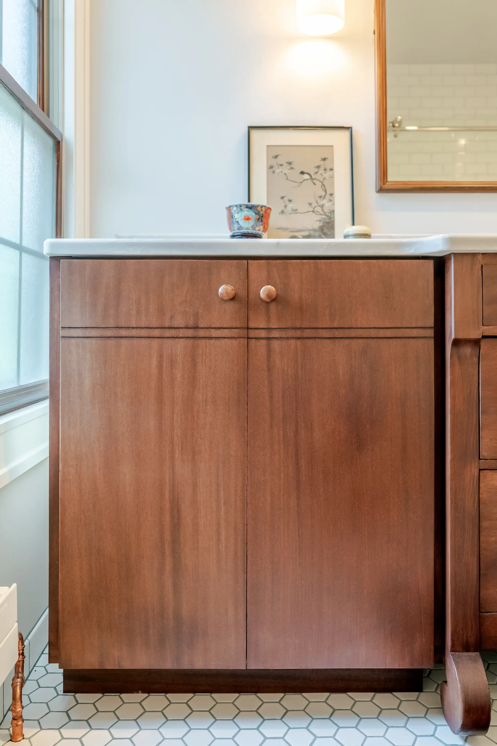 We update homes to the way we live. Older homes do not typically afford laundry spaces outside of the basement because they were not common appliances until the 1950s. This house was built around 1915 with a total of 5 baths. Combining the laundry + bath was a solution aesthetically and from a functional standpoint. Other modifications to this bathroom included removing the 100 + year old tub to build a spacious walk-in shower. In front of the shower, we used a dresser and converted it into a vanity. This family heirloom was originally from a farmhouse in Illinois. On either side of the vanity, we built custom shelving to match its aesthetic for additional storage, large enough to accommodate laundry baskets. Additional elements of the bathroom include custom shelving above the laundry, stackable laundry for efficiency, adaptable shower equipment for safety, frosted glass on the window to maximize natural light, custom woodwork throughout.